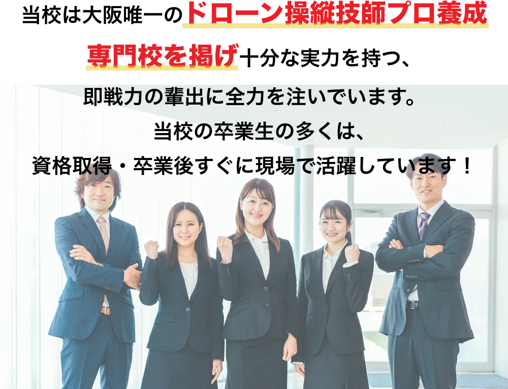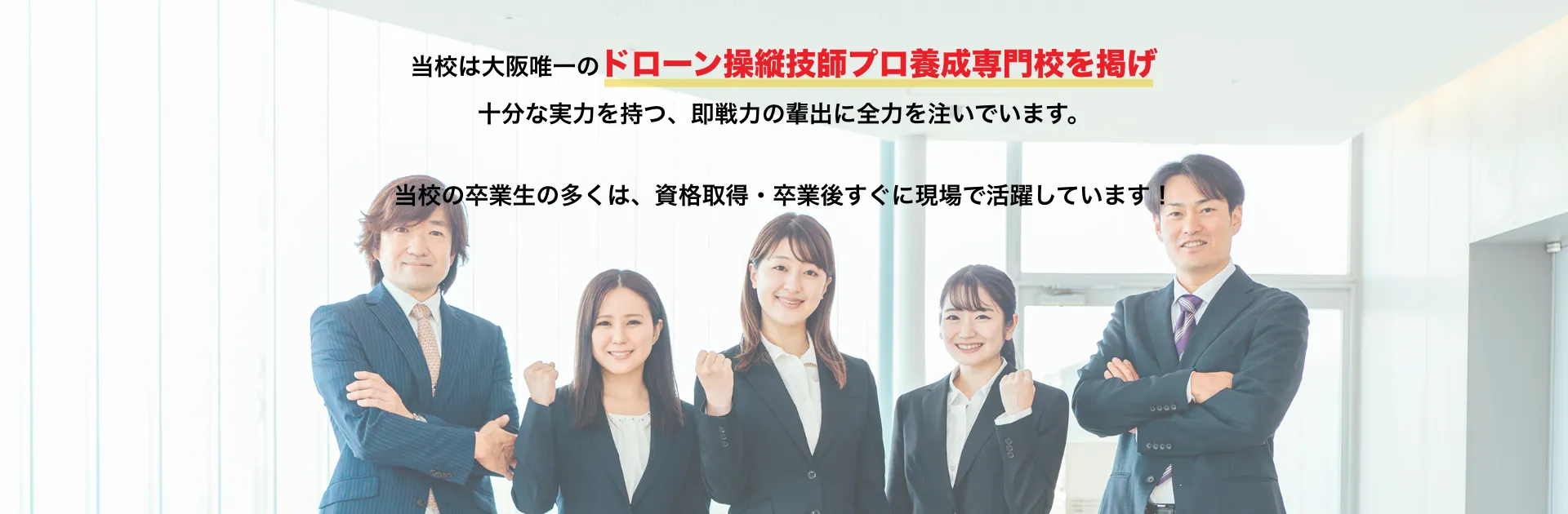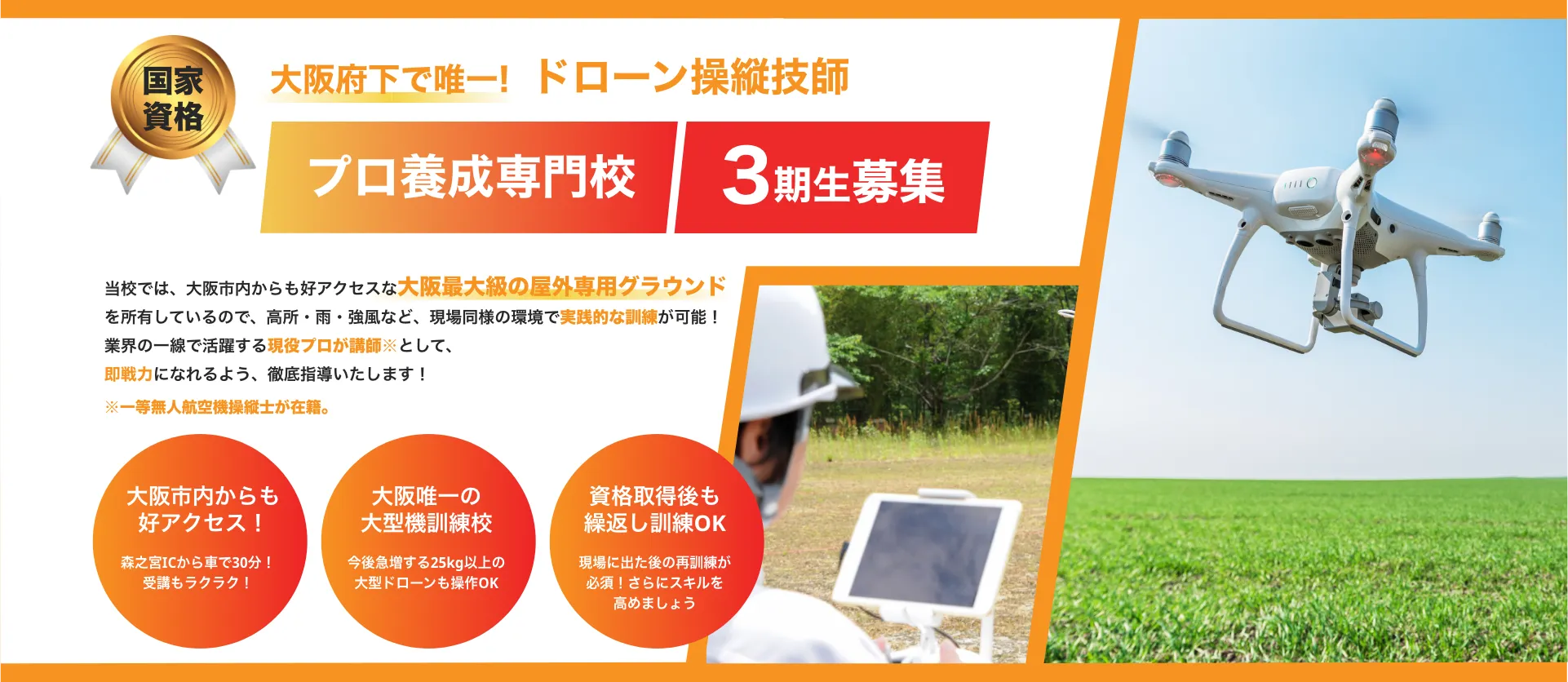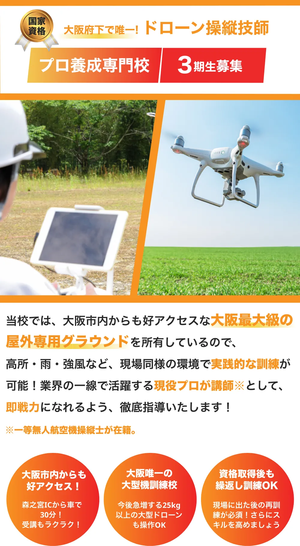 国家資格取得後には、建造物の赤外線点検、空撮、輸送、農薬散布、FPVの専門技能を学ぶためのコースを受講することも可能です。実務も直結するこれらのコースを専門的に実施できる講師・カリキュラム・環境を持ったスクールは非常に少数で、関西では当校のみとなります。
